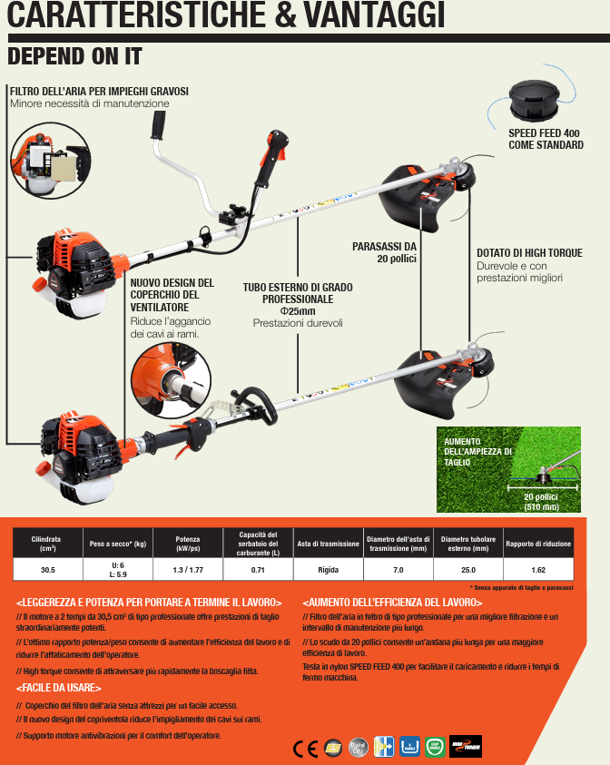 Dotato di una nuova motorizzazione da 30,5 cc, abbinata al sistema High Torque ECHO, questo modello garantisce eccezionali performance di taglio, coppia elevata e una risposta immediata anche su vegetazione resistente, rovi e sterpaglie fitte.