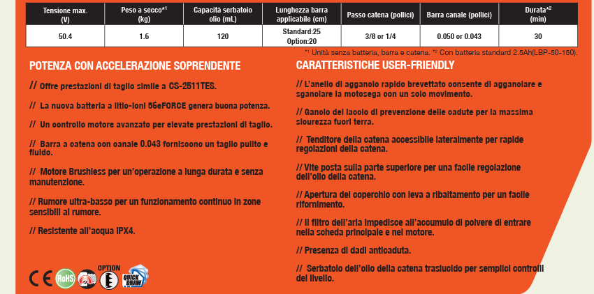- Tecnologia E-Force: potenza e prestazioni comparabili a quelle delle motoseghe a scoppio, con una maggiore efficienza energetica e un minore impatto ambientale.